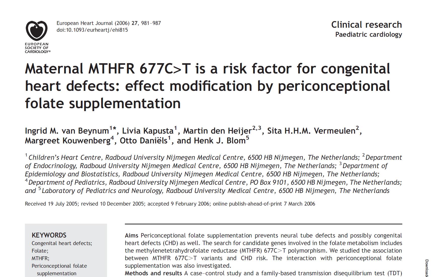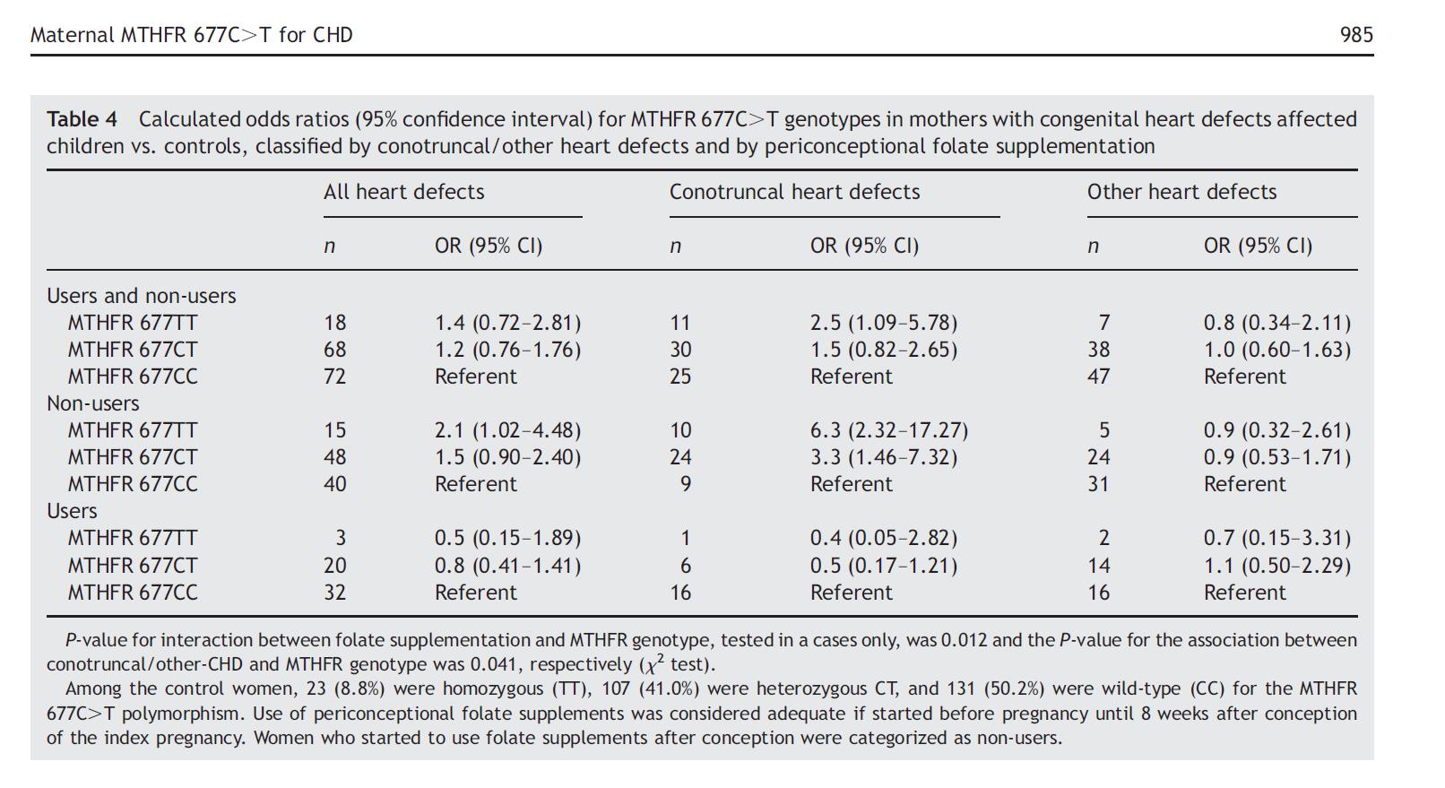 Inter familias 165 cum congenita morbus cordis (CHD) et familias imperium 220, matres quae MTHFR portaverunt 677 CT vel TT genotypum et supplementa folatium pericon- ceptionali non sumpta erant multo magis verisimile habere puerum cum defectus conduction-genus cordis (OR 3.3 et 6.3, respective).
