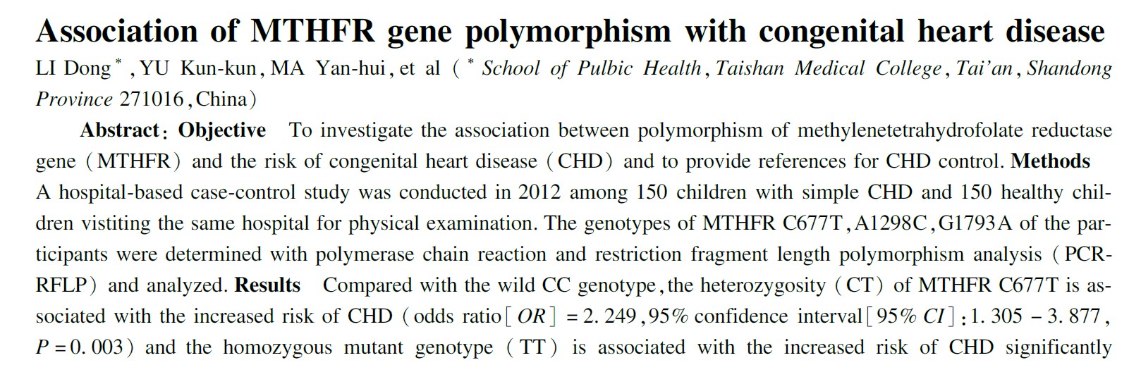 Studium de Qilu Hospitalis Puerorum Shandong Universitas ostendit T allelam MTHFR C677T augere CHD dissidentis 1.8 triplicem; TT et CT genotypa periclitantur ad 3.1 triplicem et 2.2-duplicem.