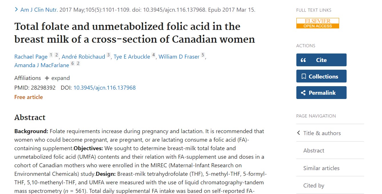 Page R et al. Totalis folatium et folicum acidum folicum in mammis lactis Canadiensis feminis. Am J Clin Nutr 2017;105:1101-9.