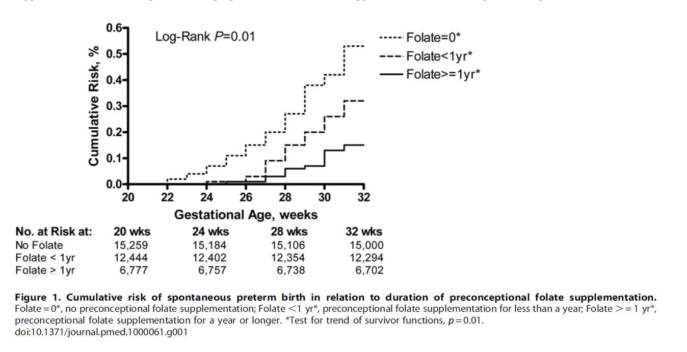 [1] Bukowski R, et al. Preconceptional folatium suppletionem et periculum spontaneum irritum: cohortis studium. PLOS Med. 2009 May;6(5):e1000061.