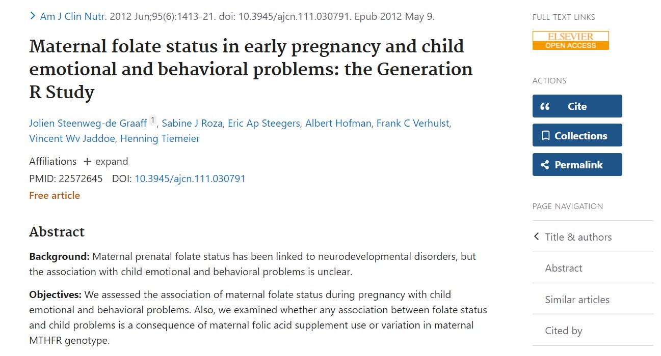 [1] Steenweg-de Graaff J, et al. Maternus status folatium in primo graviditate et infante motus et problematum humanorum; R Study. Am J Clin Nutr. MMXII, 95: 1413-21.