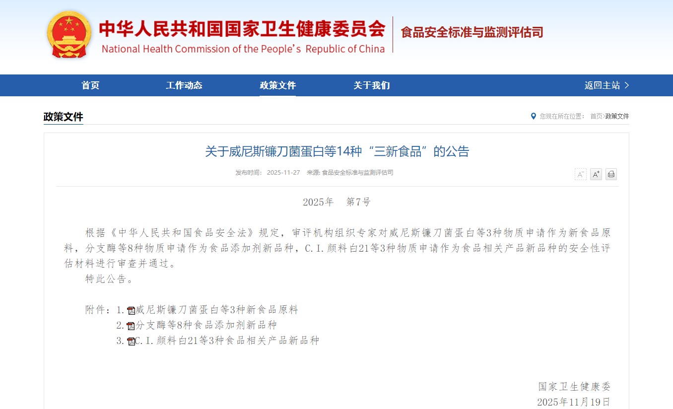 Jinkang Hexin initiavit application processus pro usura 6S-5-methyltetrahydrofolatum calcium in farinae triticeo mense Martio 2025. Post octo mensibus strictioris recensionis, approbatione formali concessa a National Health Commissio die 19 mensis Novembris anno 2025 ac publice denuntiavit die 27 mensis Novembris anno "Nuntiatio die 14" Tres Novi Ciborum Complectens Venetum Fusarium Protein (2025, No. 7).