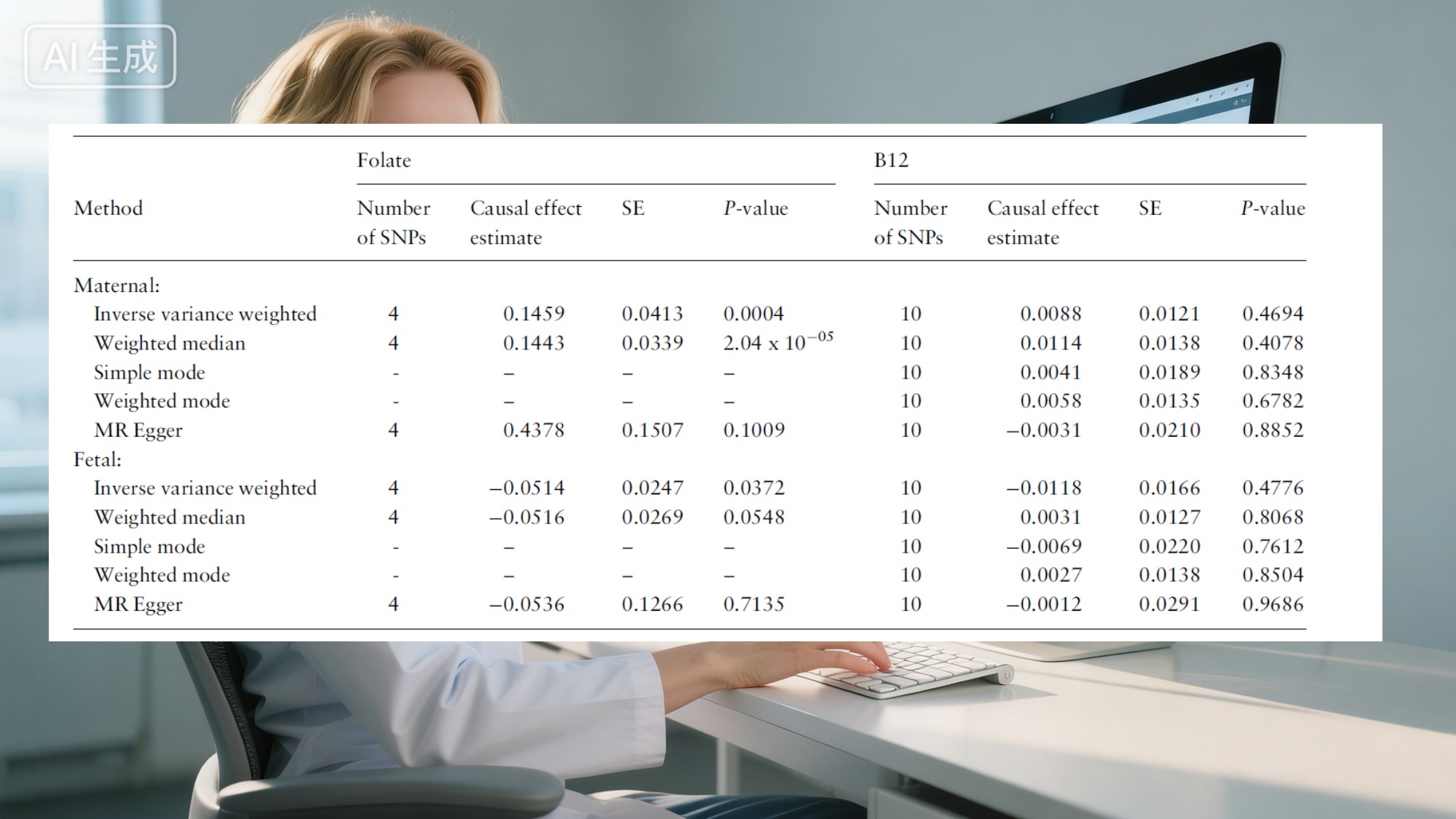 Docti eandem curiositatem fuerunt responsa quaerendo. In MMXX, theActa Societatis Internationalis Epidemiologiaestudium magnum edidit quod ultra conventionales aditus movetur. Inquisitores methodo dictaMendelian randomization, tractans differentiae geneticae naturaliter occurrentes quasi quaedam constructae in experimentis; inde reducere causas confundendi sicut victus et vivendi. Inquisiverunt utrum materna folata et B12 gradus vere influant prolem procreationem pondus. Analysis instructio notitiae geneticae ad pondus e supra relatae 500,000 hominum, plus Vitaminum gradu mensurae plus quam 45,000 populus, valida pro comperta praebens subsidium.