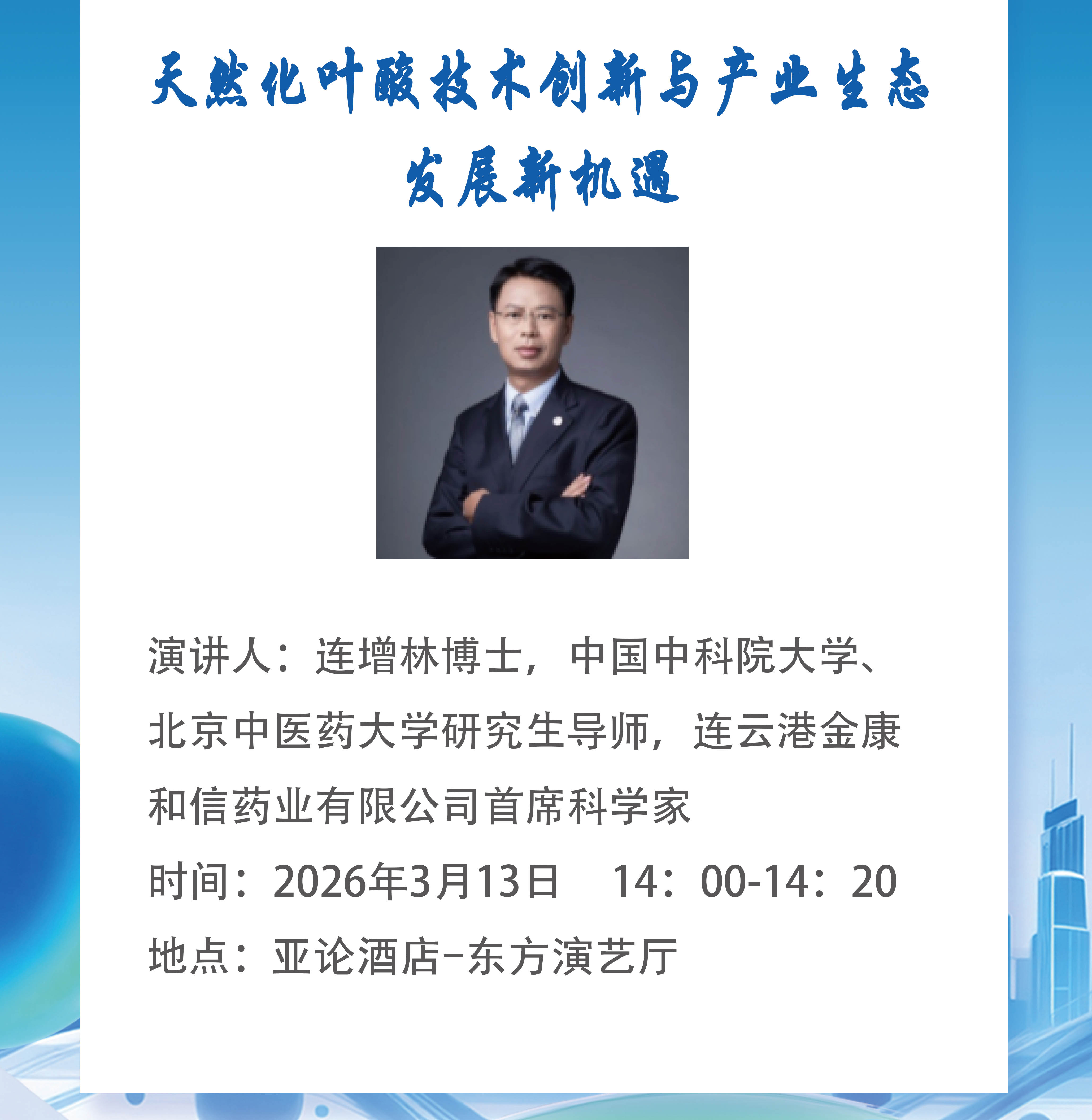 Hoc spectaculo, Dr. Lian Zenglin, dux Physicus Jinkang Hexin, notam notam tradet, quae inscripta est Technologica Innovatio Naturalisationum Folata et Novae Facultates Industriales Progressio oeconomica die 13. Martii oratio in tres nucleos erit directiones: Commoda technologica naturalisation folatium; Diversificari industriae applicationes, et novae opportunitates cooperationis globalis. Non vult reserare aciei technicas indagare et explorare practicam et accessible occasiones industriae innovandi in faucibus. Collegia in cibo et sanitate industria invitantur sincere ad audiendum, audiendum, mutandum notiones, et communiter explorare infinitas facultates industriae innovationis et progressionis datum per folatium naturalization.