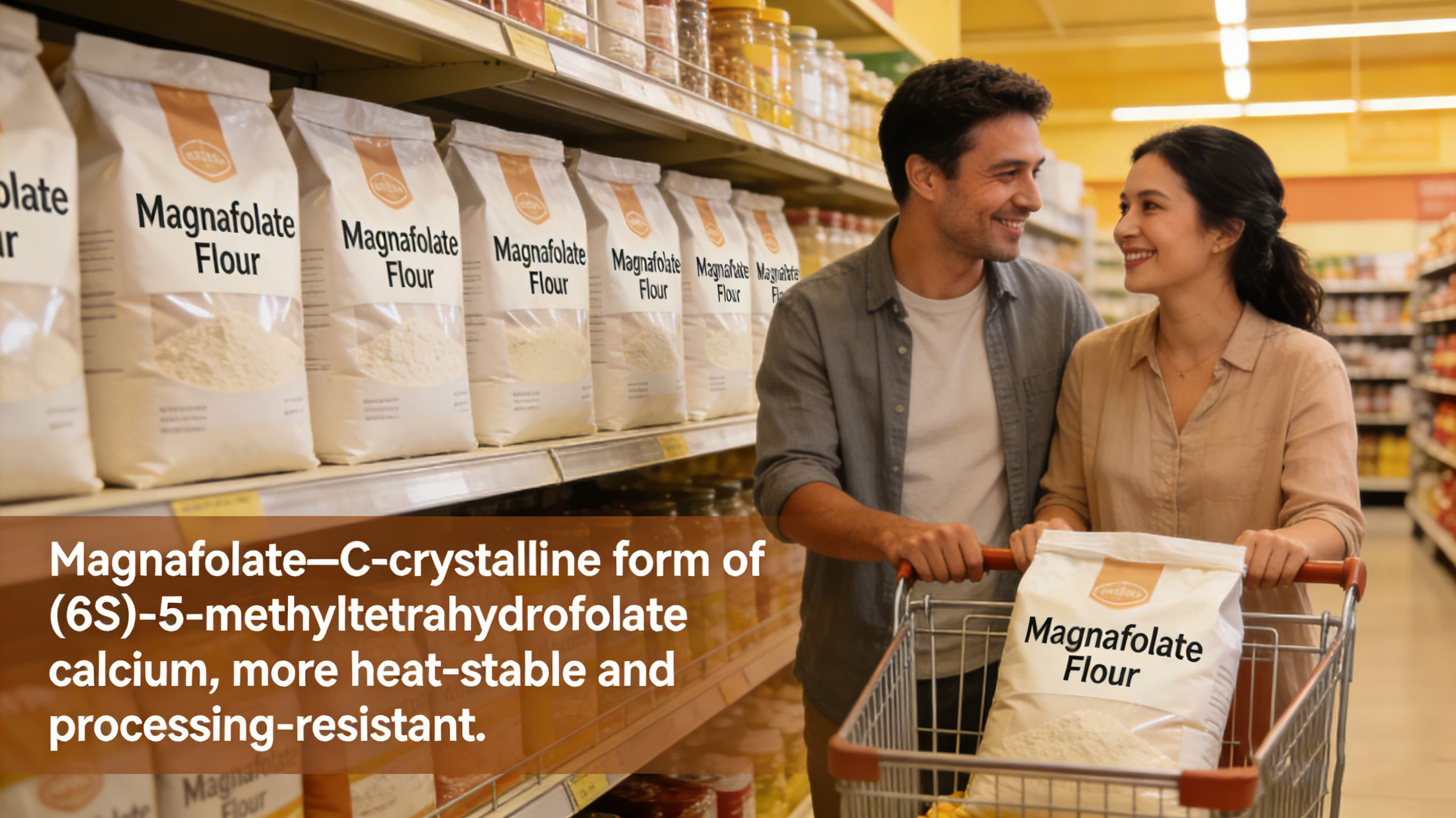 Magnafolati cessum verum technologicum effodiendi repraesentat. Haec naturalisatio folatium directe absorberi potest sine conversione metabolicae. Est autem C forma crystalli stabilis, quae calor resistens et stabilis est. Molendina farinaria farinam munitam producere possunt utentes apparatu suo existente, nullo addito obsidione requisito.